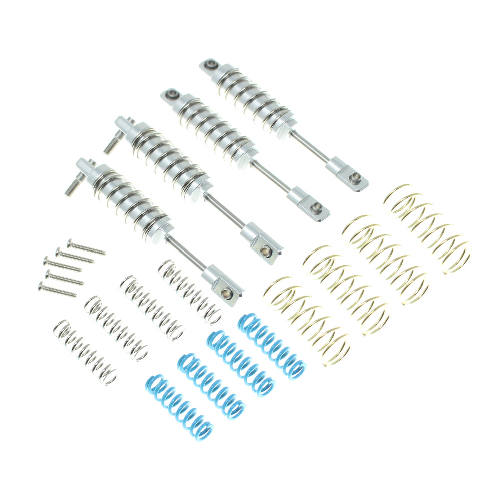 CNC Aluminum Shocks with included options for internal springs to adjust for different bounce rates. Hard (Blue), Medium (Chrome) & Soft (White). (Soft springs are pre installed).